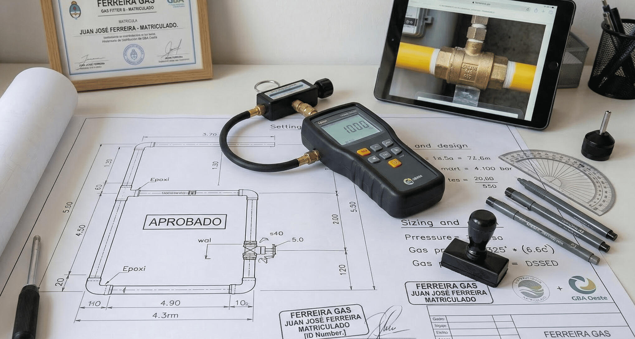 Detección técnica de fugas en cañerías principales. Confección y firma de planos aprobados por la distribuidora. Tu instalación respaldada por un profesional matriculado.